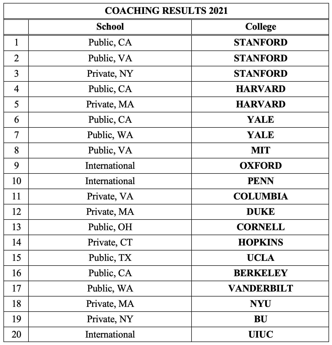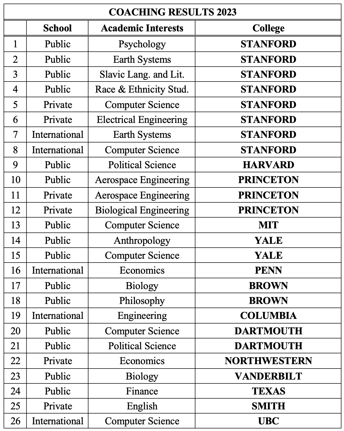 The coaching results below are the final schools students selected. Many other schools admitted them and many more rejected them. Some received scholarships. To be clear: Students get themselves into college. They do the activities, win the awards, and write the essays. We help kids present their most strategic, compelling, student-selves to admission officers. These students got in on their own merit, hard work, luck. Did we help? Yes. But it’s disingenuous to suggest these students got in because of Admitium.