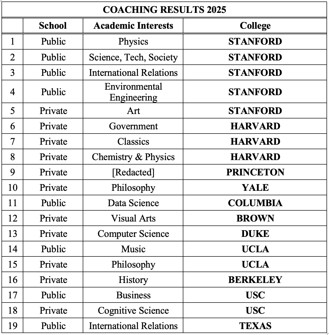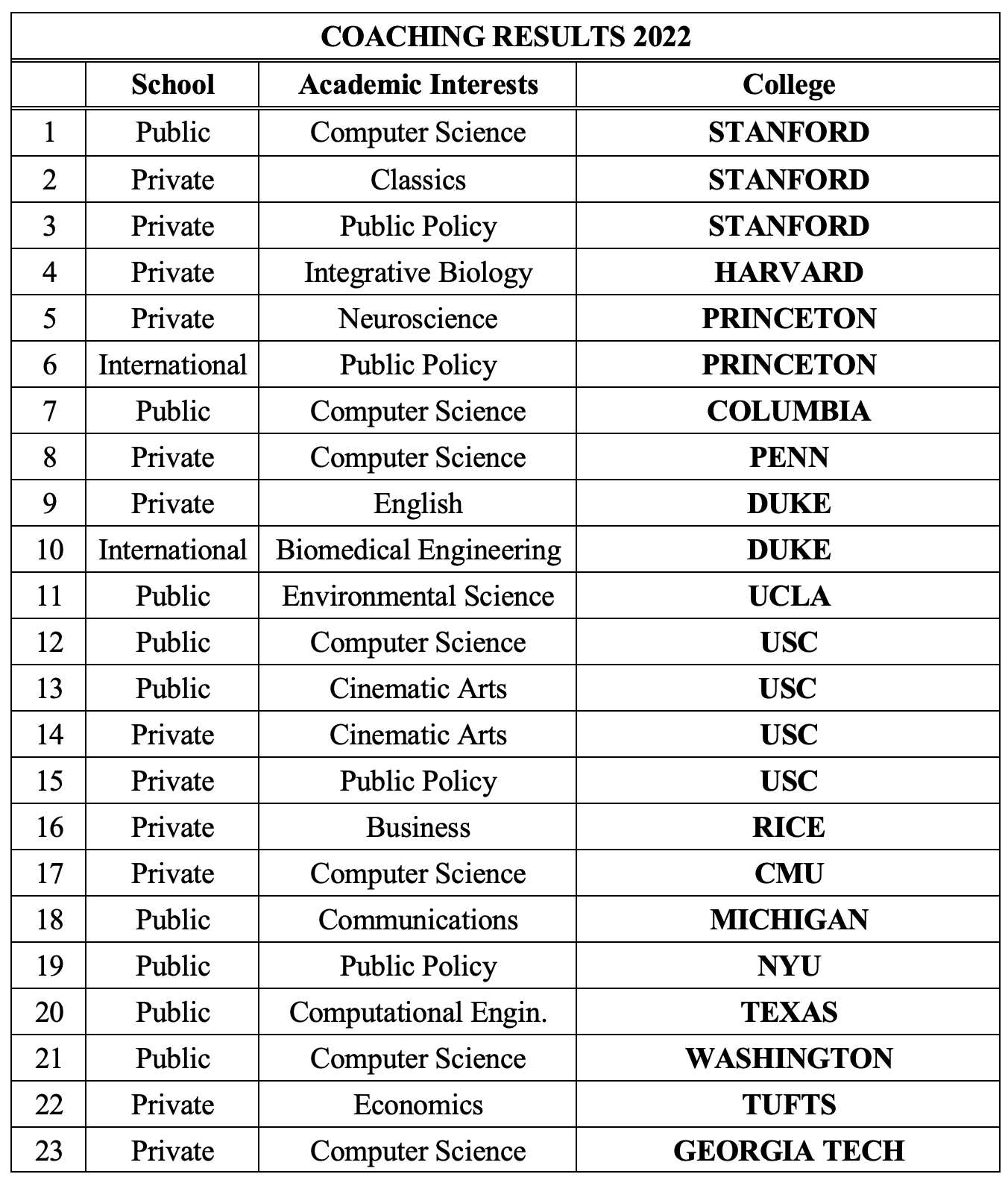 Admissions Masterclass teaches you everything you need to make your application compelling. Start there. If you’re smart and apply yourself that course is all you need. My goal is to license Masterclass to public schools and nonprofits to make it available to all students for free. But until that happens, we’ll coach a small cohort of students each year.